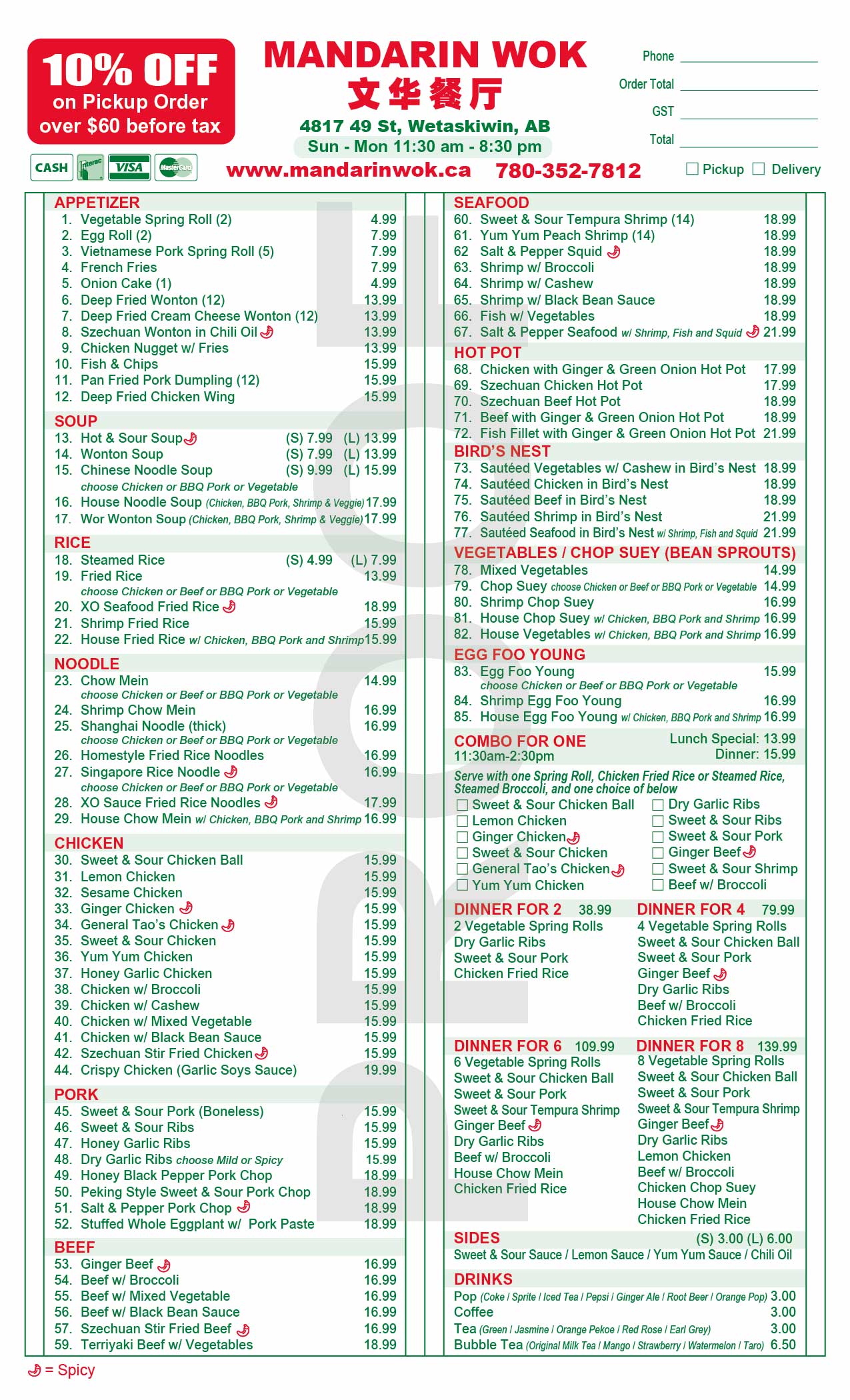 8 Vegetables Spring Rolls Sweet and Sour Chicken Ball Sweet and Sour Pork Sweet and Sour Shrimp Ginger Beef Dry Garlic Ribs Lemon Chicken Beef with Broccoli Chicken Chop Suey House Chow Mein Chicken Fried Rice